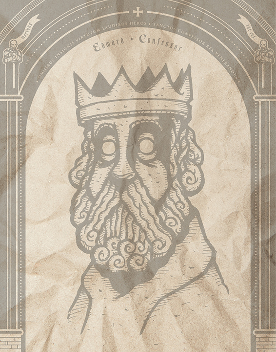 Edward the Confessor, among the last truly English kings by blood. The epitaph at the top, from his tomb in Westminster Abbey, translates from the Latin as: "Confessor, king, and saint, he sought the skies. Friends, lift to heaven your hearts as well as eyes."