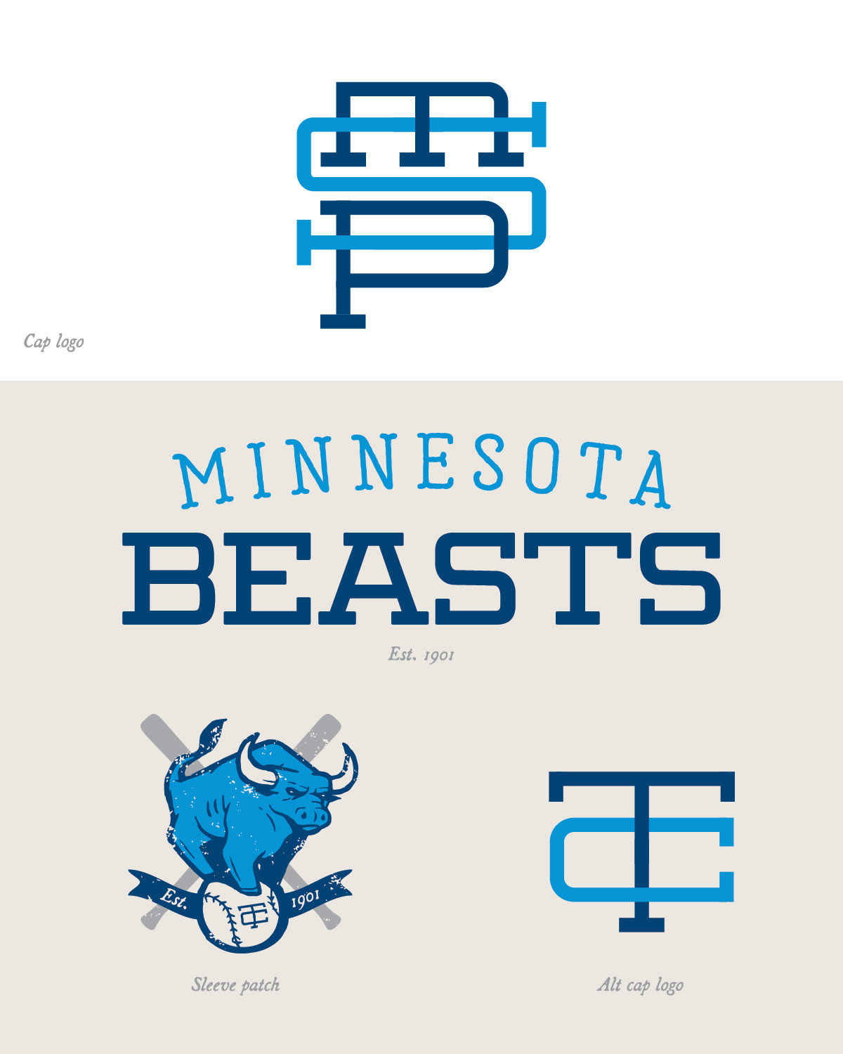 Retro rebranding concept for MLB's Minnesota Twins, imagining what they might have looked like if they'd been founded during the Deadball Era and renamed the Minnesota Beasts.