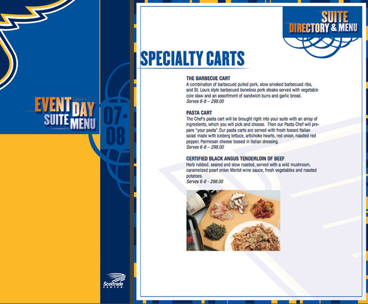 Tri-fold menu for Scottrade Center suiteholders. Full front spread shown, when folded the left 1/3 becomes the menu cover.
